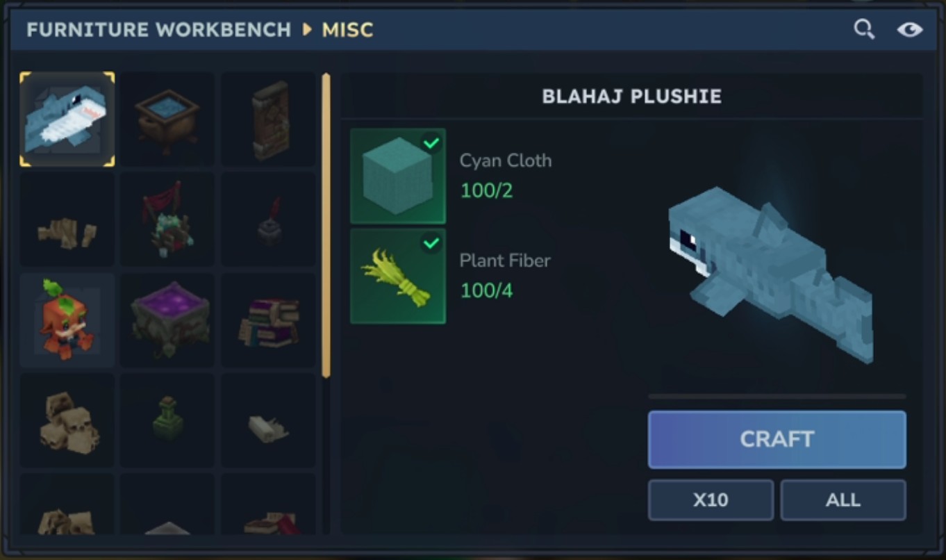 Crafted in the furniture workbench by combining a tavern bed with a Blahaj plushie.